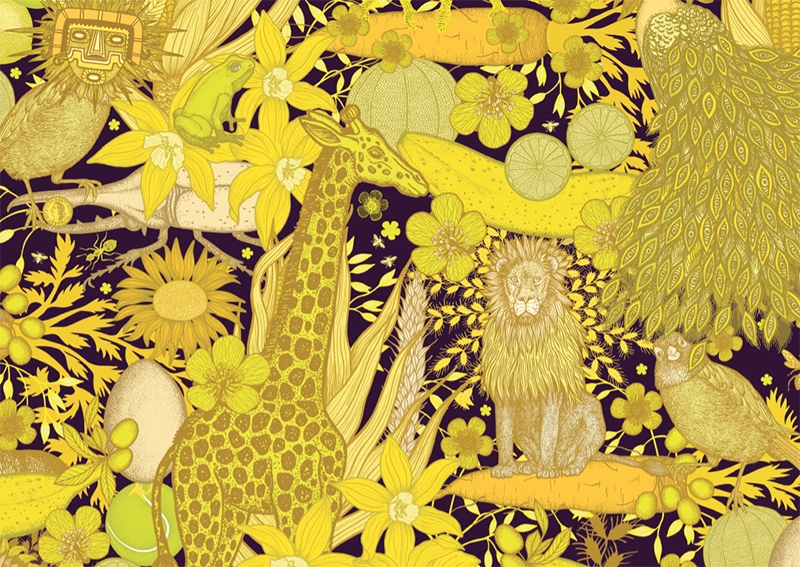 Sur chaque double page, une couleur et ses nuances, et les élements de la faune et de la flore qui lui sont caractéristiques, des plus évidents (Jaune = tournesol) au plus loufoque (jaune = balle de tennis).