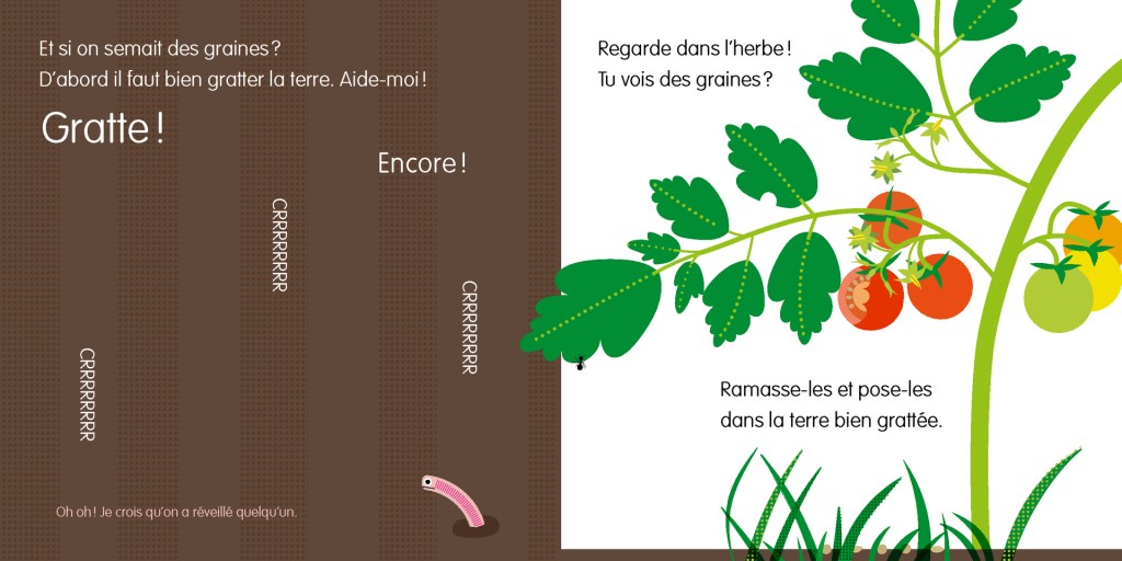 Avec cet album, on découvre le jardin. On commence par semer des graines, les arroser….On ira cueillir des fruit, sentir des fleurs …