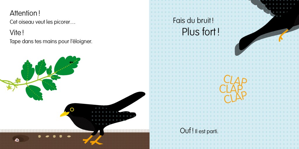 Regarde! est ce que j’appelle un livre intéractif : lors de la lecture, l’enfant a des « missions » : taper dans les mains, grater, souffler… Ces ouvrages apportent réellement une autre dimension à la lecture avec les touts petits. Ils sont si fiers de pouvoir accomplir ces petits gestes pour faire avancer l’histoire et voir ce qu’il va bien pouvoir se passer grâce à eux sur la prochaine page.