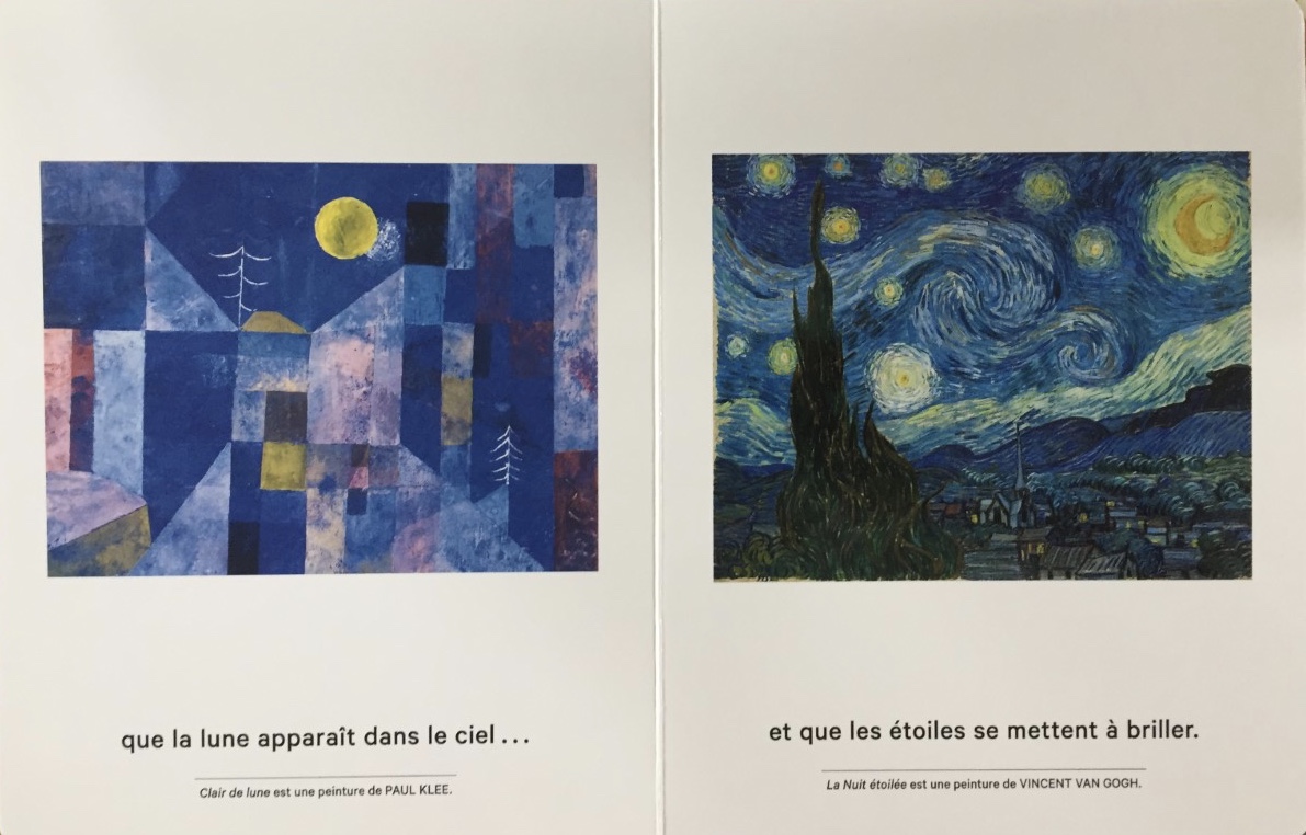 Ce que j’aime dans ce livre c’est qu’il y a une vraie histoire, l’auteure a choisi pour chaque pleine page, une oeuvre (toutes périodes artistiques confondues) en adéquation avec un texte simple. Je trouve que c’est une belle façon de familiariser nos enfants aux Beaux-Arts. Vous pourrez par exemple choisir une page a détailler chaque soir avec votre enfant.