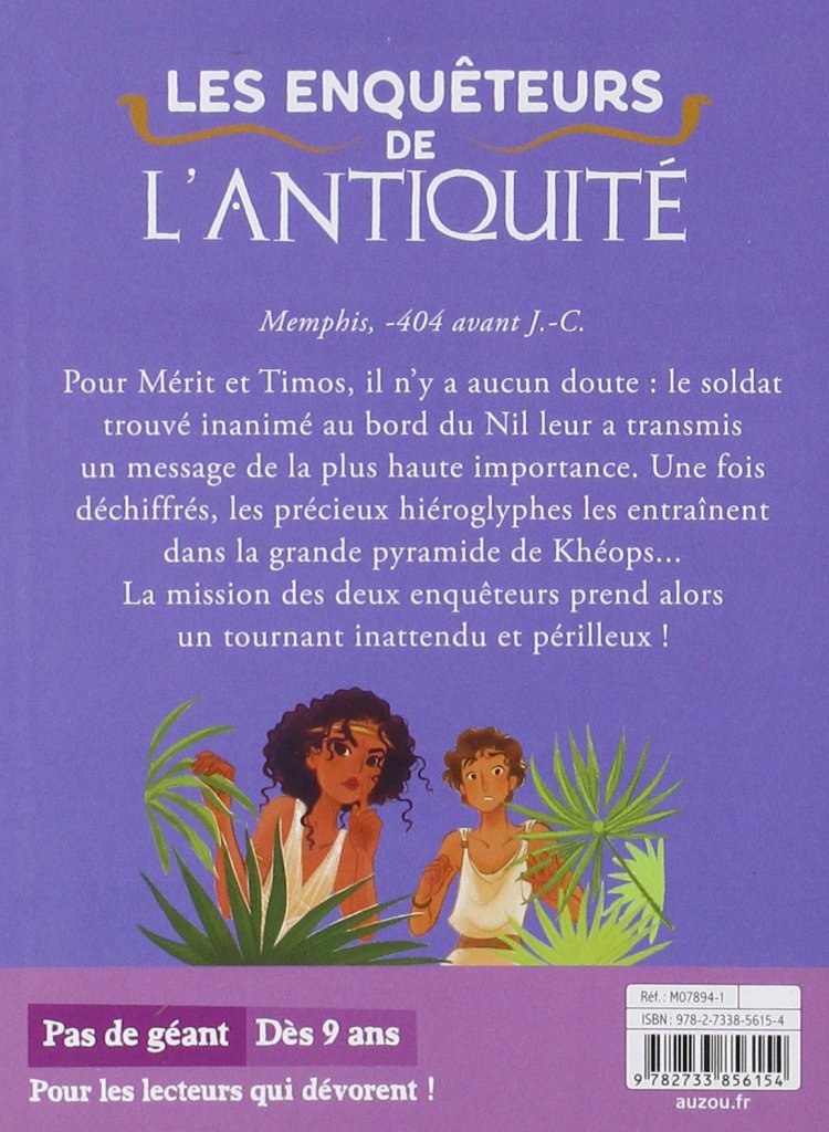 Ce livre nous plonge dans l’antiquité egyptienne (Ve siecle avant JC), avec Merit jeune servante à forte tête et son ami Timos, fils d’un marchand d’huile d’olive. Un soldat blessé leur a transmis, avant de mourir, un message important à transmettre. Les deux amis vont risquer leur vie pour mener à bien cette mission de la plus haute importance.