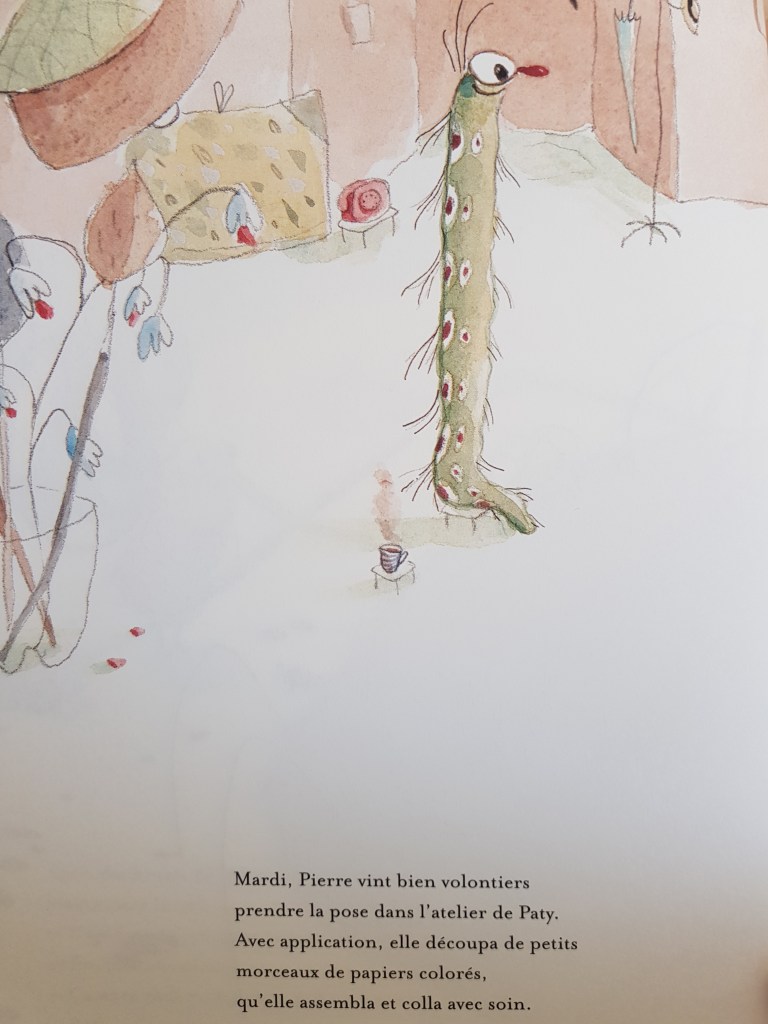 Il ne reste plus que quelques jours à Paty pour préparer son exposition. Rien n’est prêt. Elle demande donc à ses amis de venir poser pour elle. Ils ne se font pas prier. Après des heures de pose, Isabelle l’araignée sera immortalisée à l’aquarelle, Pierre le ver en collages, Mona la crevette à l’encre.