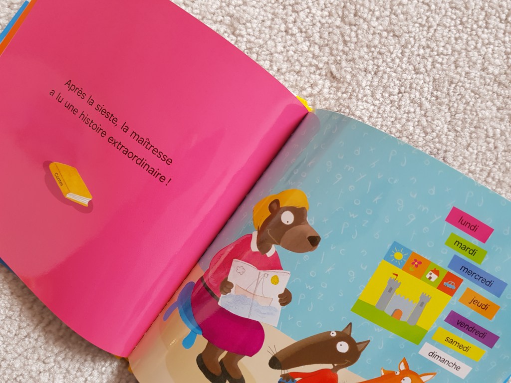 Peu de texte dans cet album : une ou deux phrases par double page, et ça suffit. Le livre passe en revue le déroulement d’une journée à l’école en maternelle (Certes, celui-ci est un peu différent dans les écoles Anglaises, mais je n’ai pas trouvé que c’était un problème).