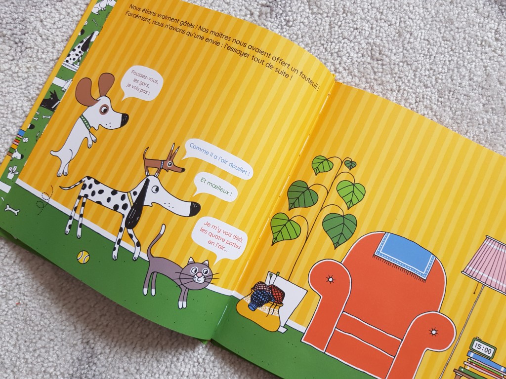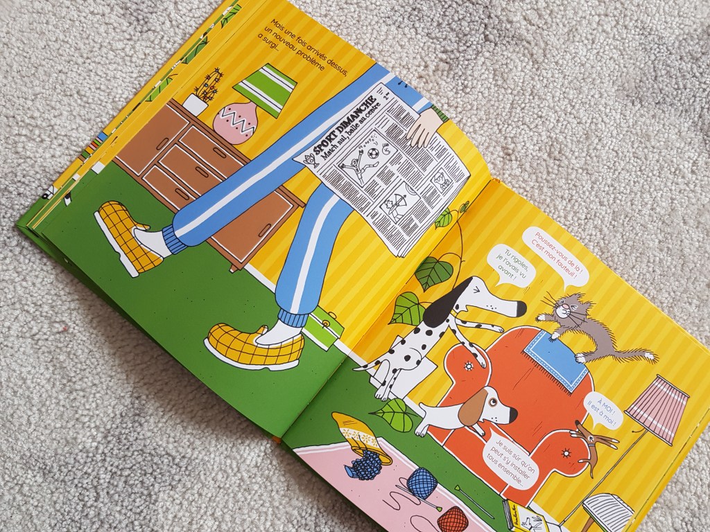 Les illustrations d’Arnaud Boutin sont simples et colorées plairont énormément aux enfants. Sur chaque double page, un court texte et des bulles façon BD, parfaites pour ce genre de situation ultra vivante.