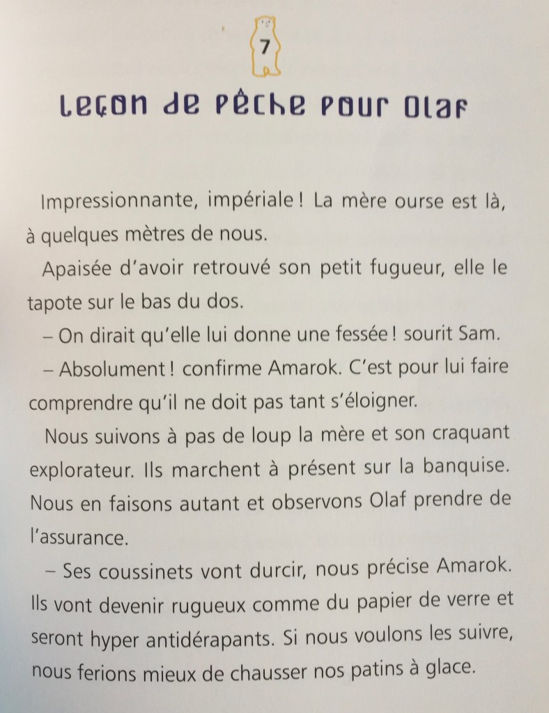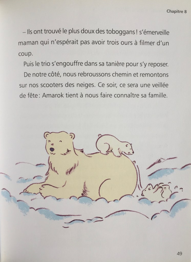 Les enfants apprennent aussi à construire un igloo, l’alimentation du grand nord, et évidemment une pluie d’informations sur les ours polaires, un message clair à la fin du roman, « protéger la banquise du réchauffement climatique ».