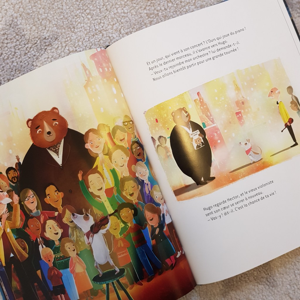 C’est Hugo qui va se mettre à jouer et son maitre va lui apprendre tout ce qu’il sait. Ce petit chien va devenir célèbre et l’ours qui joue du piano va lui proposer de le rejoindre dans son orchestre.