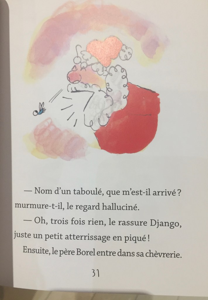 C’est un tout petit livre de 6 chapitres, c’est écrit assez gros, bien illustré par Louis Thomas. Il se lit vraiment facilement, et comme c’est très drôle, je suis certaine que ça plaira à vos enfants! Mais ne vous y trompez pas, le livre est petit mais le vocabulaire, les dialogues font qu’il s’adresse vraiment aux enfants à partir de 7 ans.