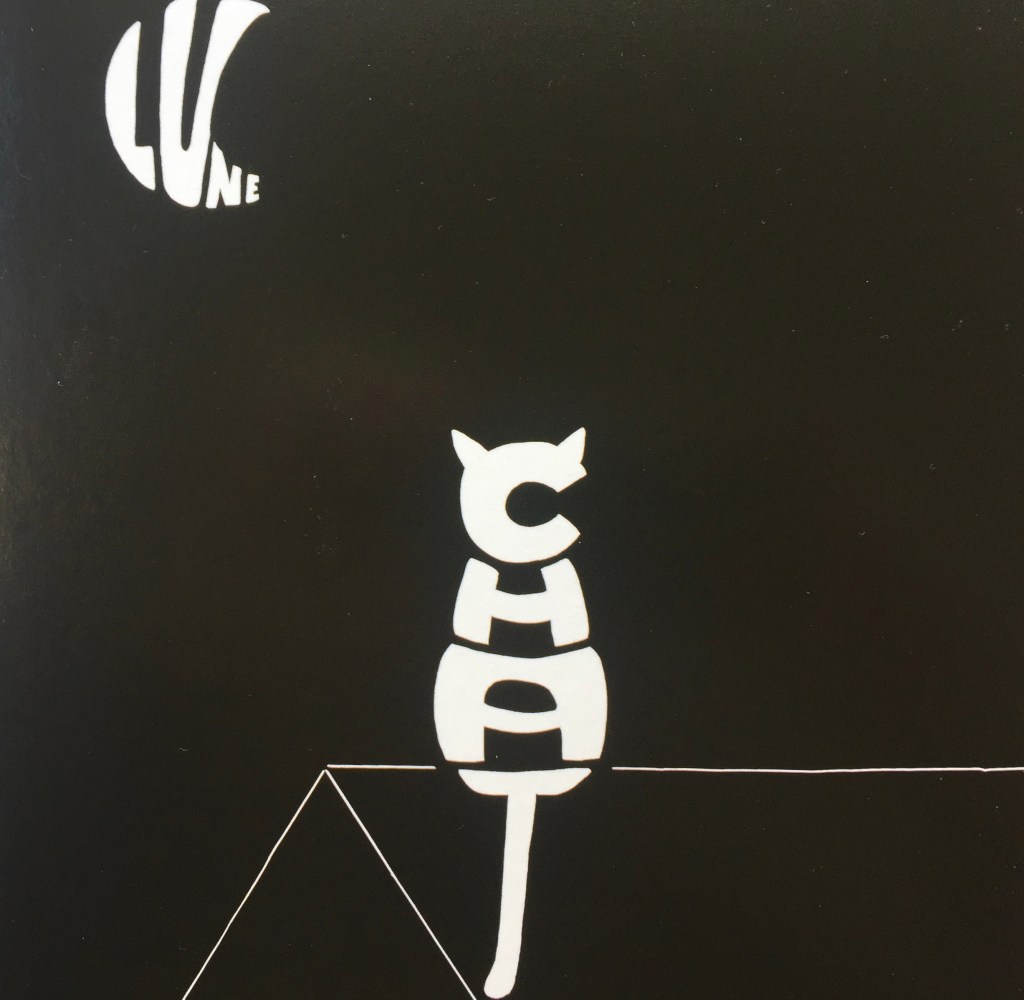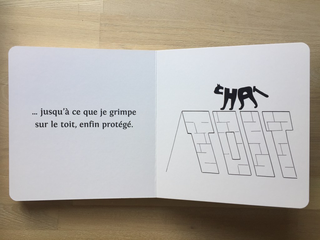Du noir et du blanc, un chat dessiné par des lettres, ça s’appelle un calligramme (enfin presque, normalement c’est un poème et il s’agit ici de mots), un texte simple. Cela permet d’allier l’imagination visuelle à celle portée par les mots.