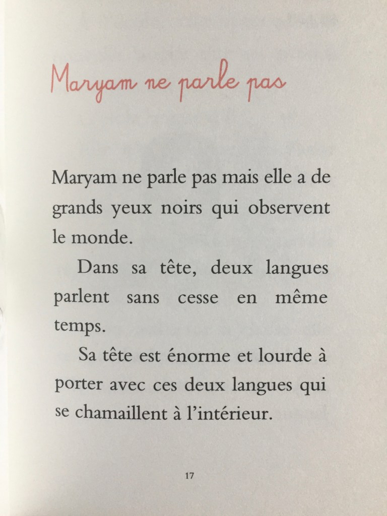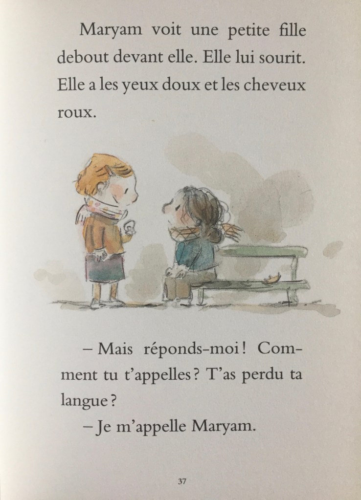 Maryam se sent seule, « Elle a l’impression qu’une épaisse bulle de solitude la rend invisible aux yeux des autres enfants. » jusqu’à ce qu’on lui tende la main, et là, tout s’éclaircit, la langue, les repas à partager, les jeux. C’est une nouvelle naissance, dans un nouveau pays avec une nouvelle culture: l’intégration (même si Maryam dit ne pas aimer ce mot), trouver sa place.