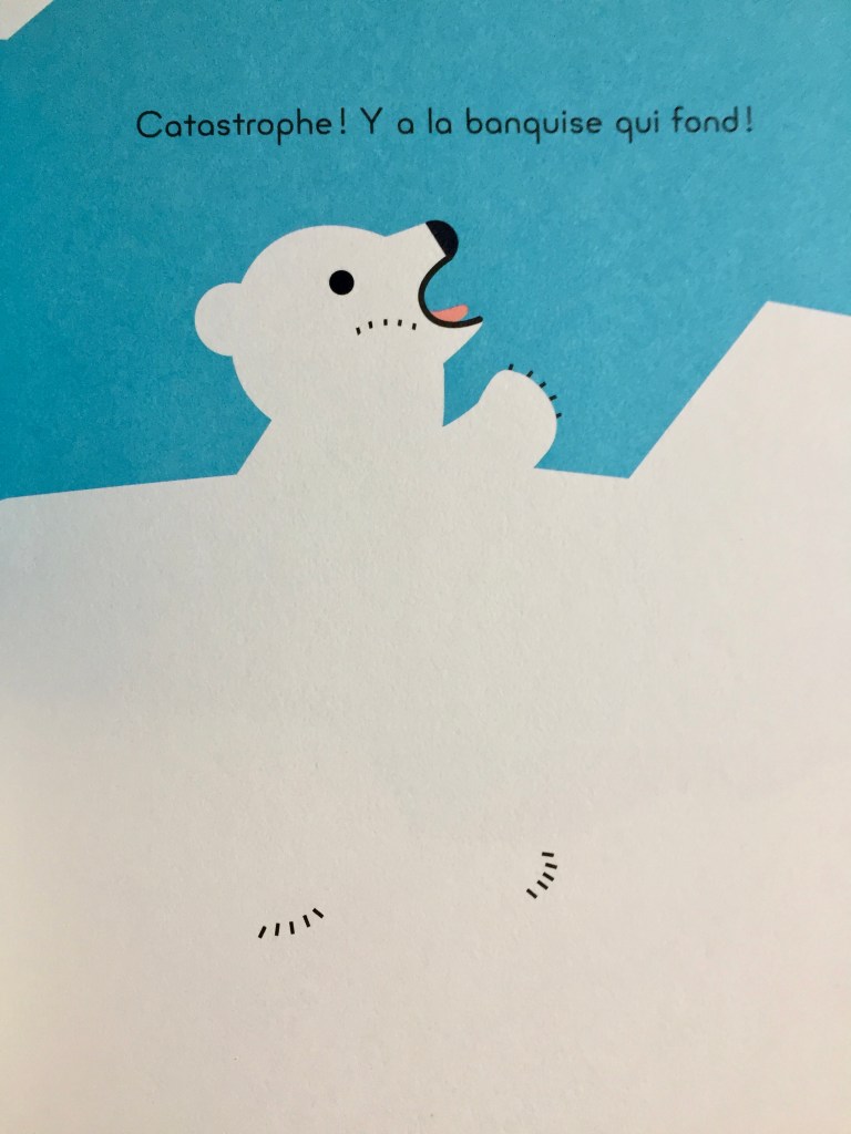 Claire a travaillé sur cet album avec le logiciel Illustrator et sa souris!!! et comme le dit si bien Claire « Ce sujet devrait préoccuper tout le monde, la banquise fond, les forêts brûlent et l’homme le sait… «