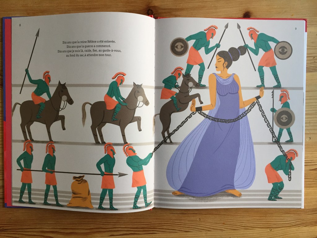 La première double page me fait penser à un Matisse, Alice me dit que même si ça n’avait pas été prémédité, elle partage mon point de vue. Plutôt que d’illustrer la première page comme la bataille sanglante qu’a été la guerre de Troie, elle a préféré travailler l’arrière plan, comme si les corps des soldats étaient figés dans un tout.