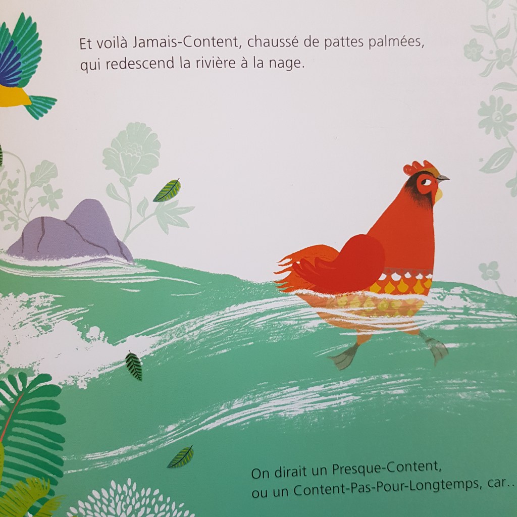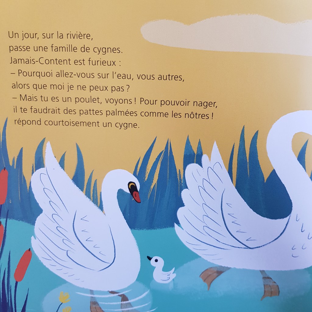 Depuis qu’il est sorti de l’œuf, le poussin Jamais-Content ne fait que se plaindre de son apparence : il voudrait bien avoir un peu de rouge au cou comme le rouge gorge, ou un joli bec jaune comme le merle, une belle queue longue et droite comme la pie…