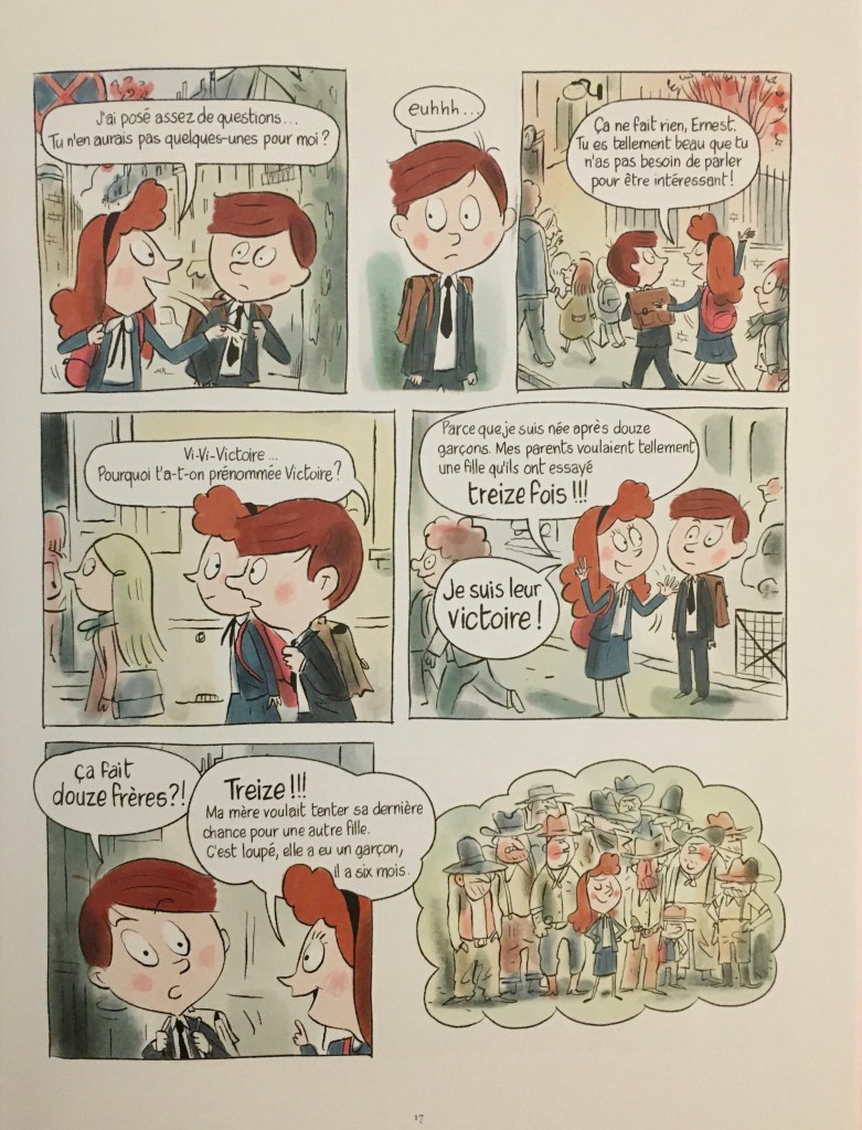 Ernest, c’est le meilleur de la classe, un enfant discret, qui attire les filles par sa beauté, peut-être son côté mystérieux, mais tout ça ne l’intéresse guère, jusqu’à l’arrivée d’une nouvelle: Victoire, qui va se retrouver assise à côté de lui.