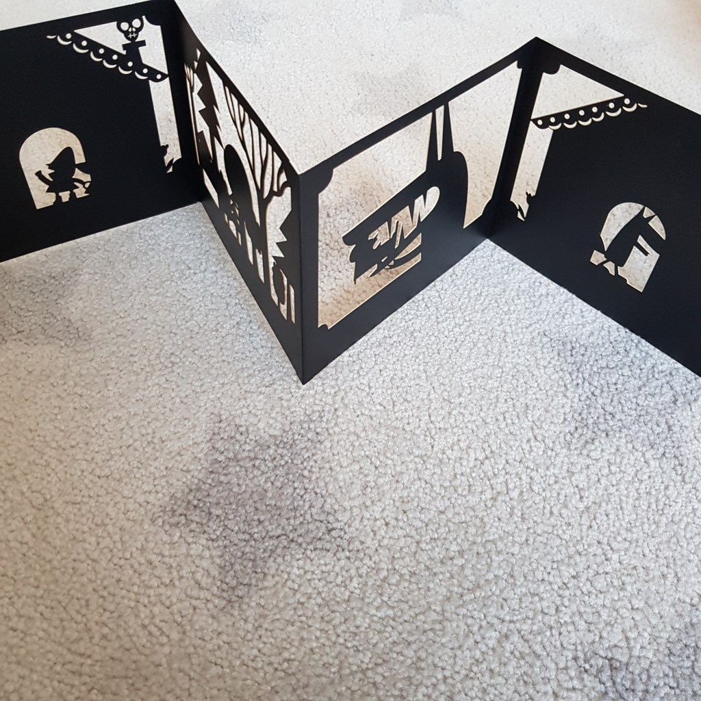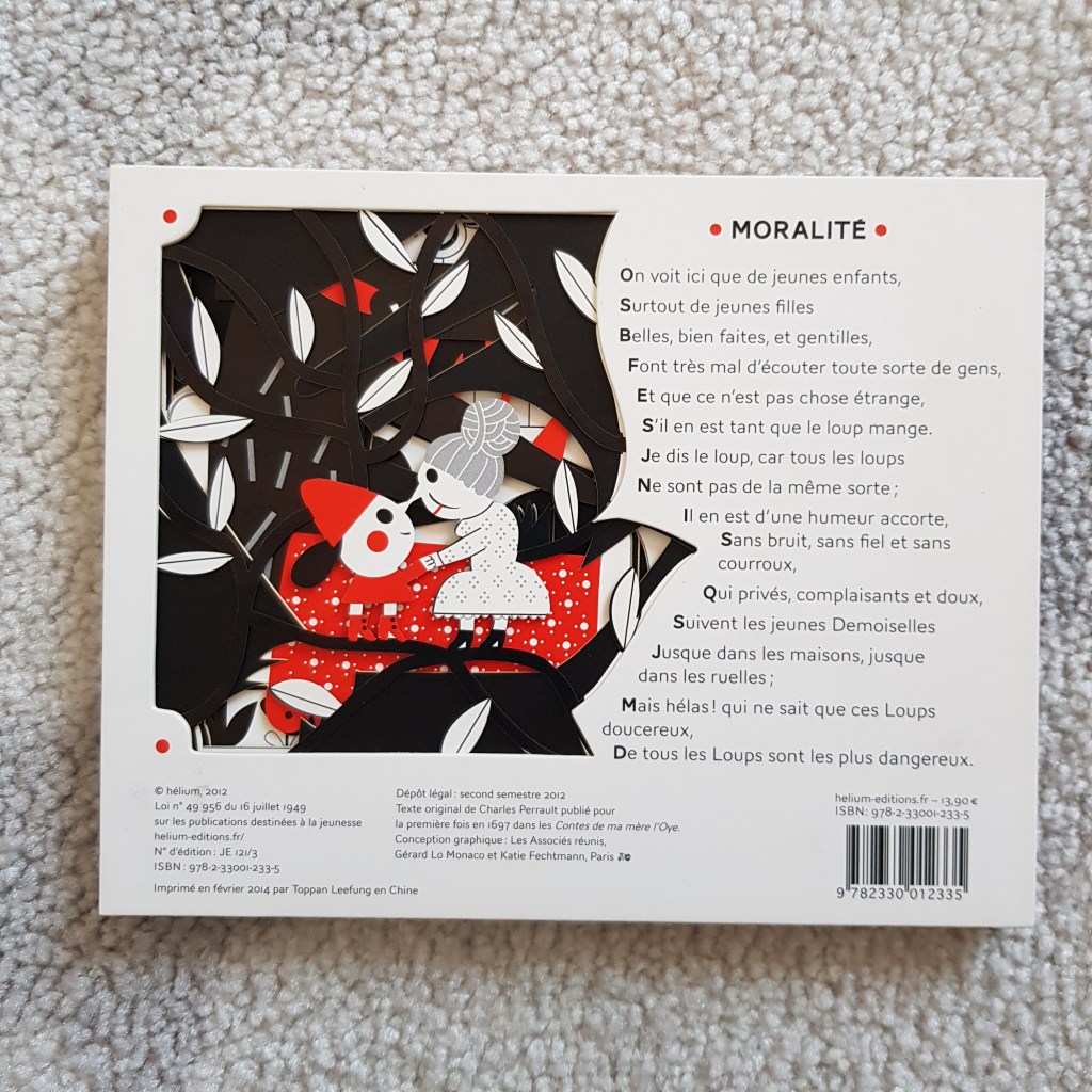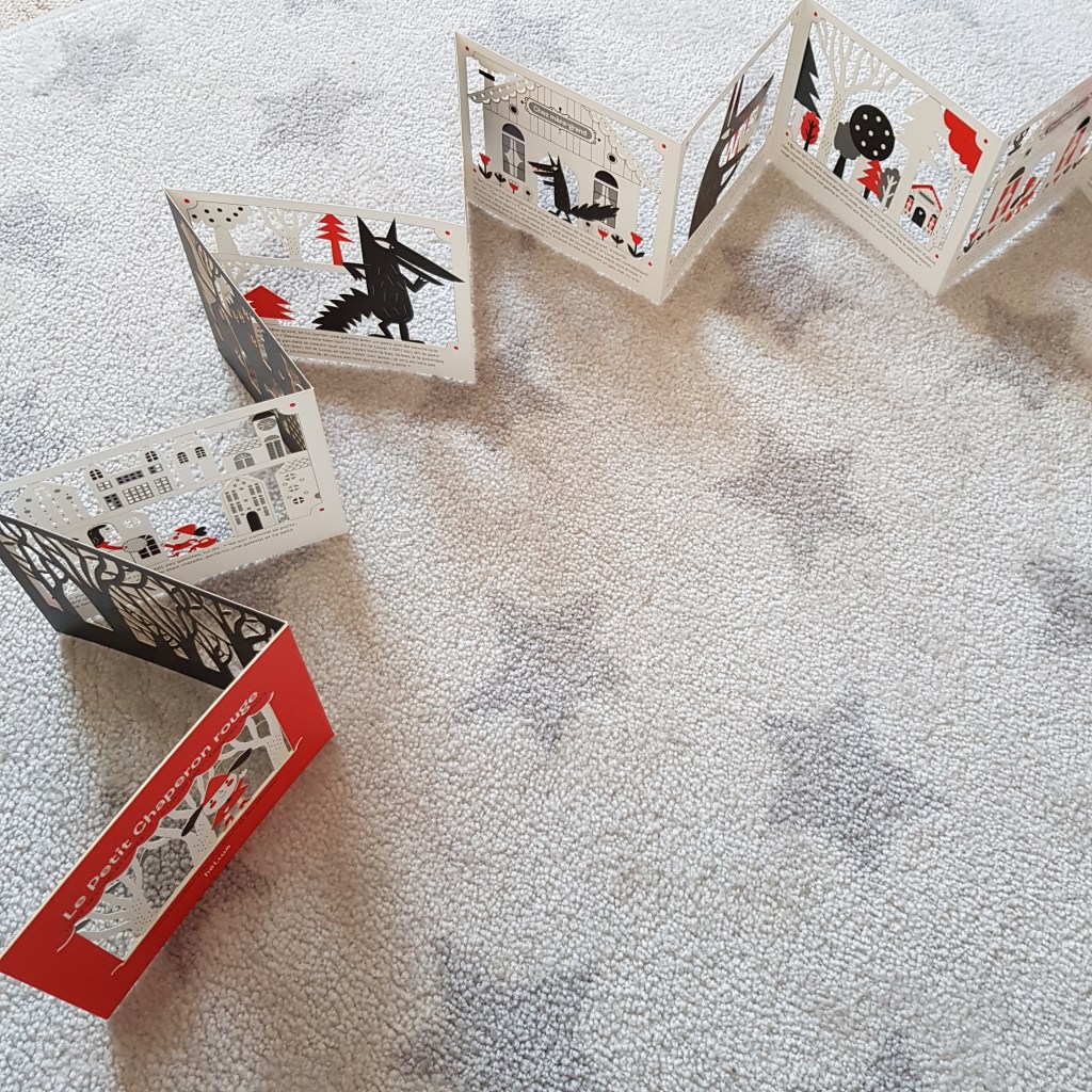 La preuve en images avec Le Petit Chaperon rouge, illustré par Clémentine Sourdais pour les éditions Hélium. Le texte est celui de Charles Perrault dans sa version intégrale (celle dans laquelle le loup mange la petite fille), donc pas de grosse surprise ici. Non, la surprise c’est le format en accordéon et les découpes.