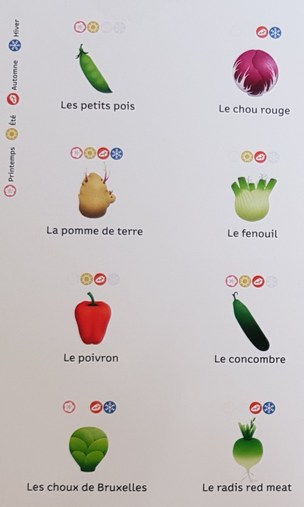 Un double page répertorie les 16 légumes abordés et un petit pictogramme nous dit quand il est récolté / quand le manger ! Une bonne piqure de rappel pour les parents aussi : c’est toujours mieux de déguster les légumes locaux de saison.