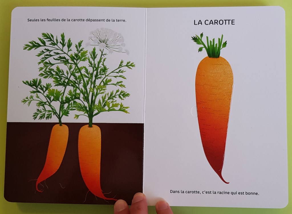 Sur la page de droite, on voit le légume illustré en gros plan. En soulevant le petit volet (ce que les enfants adorent toujours), l’enfant découvre l’intérieur du légume. Pour le texte : une info sur le légume en question sous le dessin.