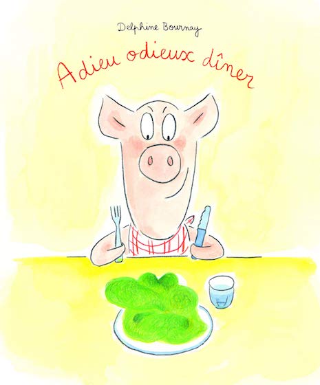 Là, c’est Flora le cochon qui fait une drôle de tête devant cette purée verte. Papa, ne veut rien entendre et laisse Flora devant son assiette. Le dîner se sentant insulté, se met à discuter avec Flora qui est, tout d’abord, très étonnée.