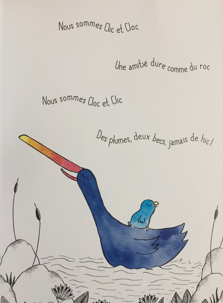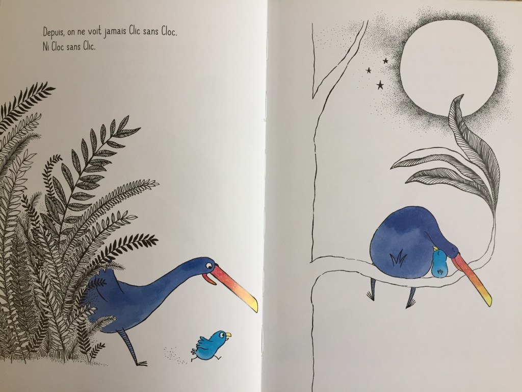 Mon fils a souvent des amitiés exclusives et c’est bien cela, le thème de ce fabuleux album. C’est l’histoire de deux oiseaux, assez différents mais tous les deux bleus: Clic est grand, il a un long bec coloré. Cloc est petit et a un petit bec jaune. Ils ne se quittent jamais.