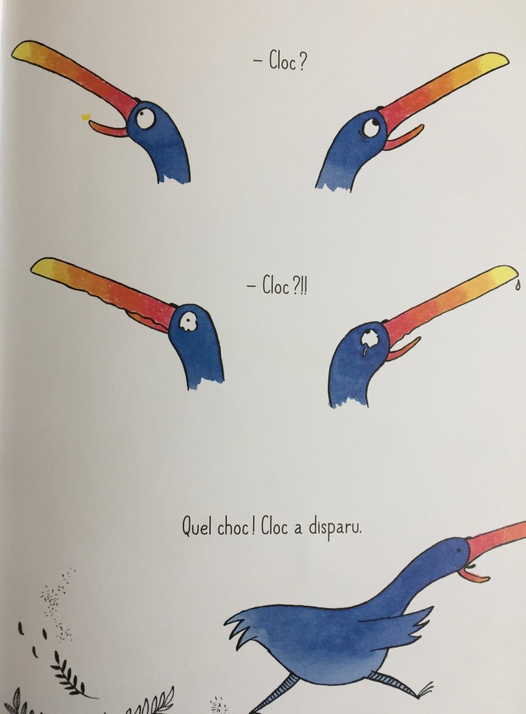 Mais un matin Cloc a disparu. Clic est complètement affolé, la tristesse l’envahit. Après de longues recherches, Clic a retrouvé Cloc, tout heureux, en train de voler avec d’autres oiseaux.