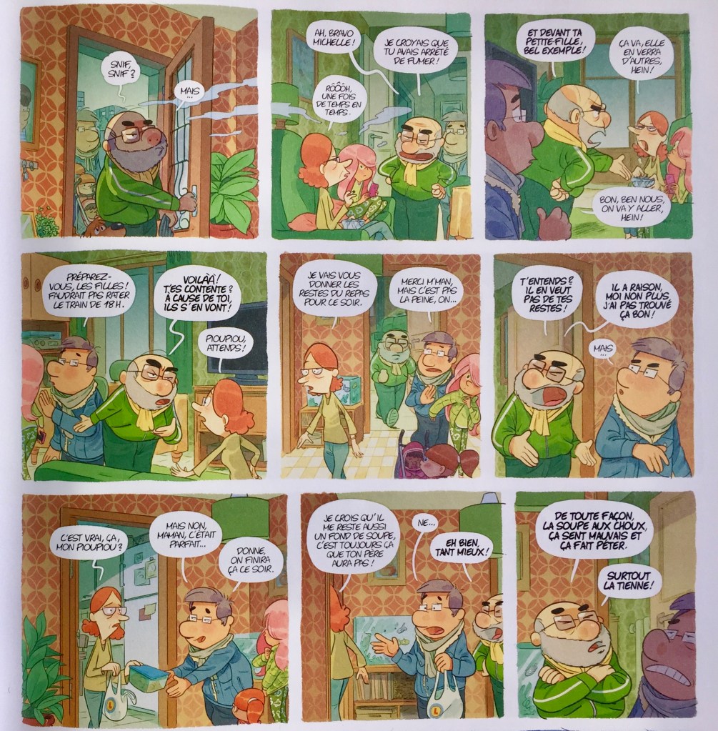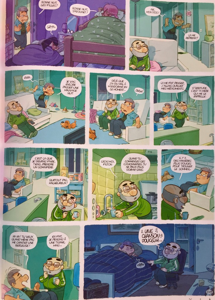 Je vous conseille ses albums à partir de 9 ans, mais je vous recommande quand même de les feuilleter avant pour vérifier que vous êtes en accord avec les dialogues. Un père célibataire avec des filles pré-adolescentes, ça peut donner lieu à quelques remarques peu ordinaires qui sans doute seront les préférées de vos enfants mais pas forcément les vôtres, les amoureuses, le « fuck » entendu et répété plusieurs fois par Bérénice le bébé.