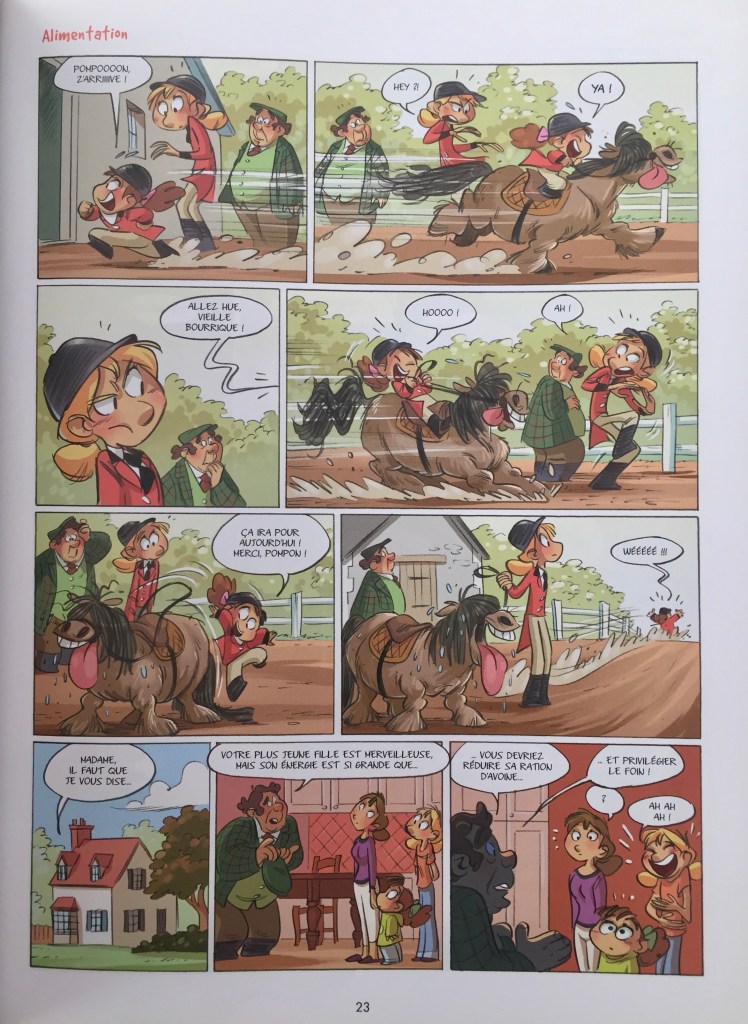 C’est vraiment sympa, les gags se déroulent dans le centre équestre des Quatre-Fers. Camomille est une cavalière élégante de 10 ans qui monte un superbe cheval prénommé Océan, mais le personnage principal, c’est finalement peut-être sa petite soeur Anais avec son cheveu sur la langue et surtout son poney pas très élégant Pompon. En tous les cas, c’est la raison pour laquelle nous classons cette BD dans « humour ».