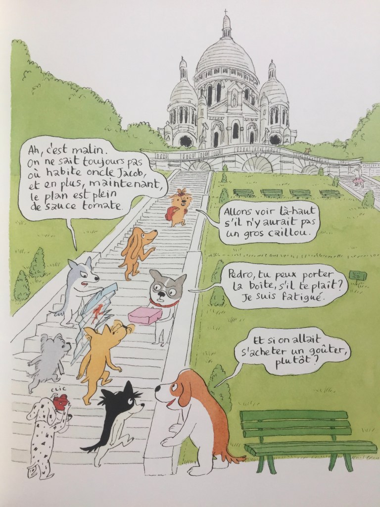 Au fur et à mesure des pages, les Toutous, complètement perdus, vont nous faire découvrir, sans le vouloir, comme des guides, de très beaux monuments ou lieux représentatifs de Paris. Enfin, eux, n’ont pas l’air hyper impressions, plutôt concentrés pour trouver l’adresse d’oncle Jacob!