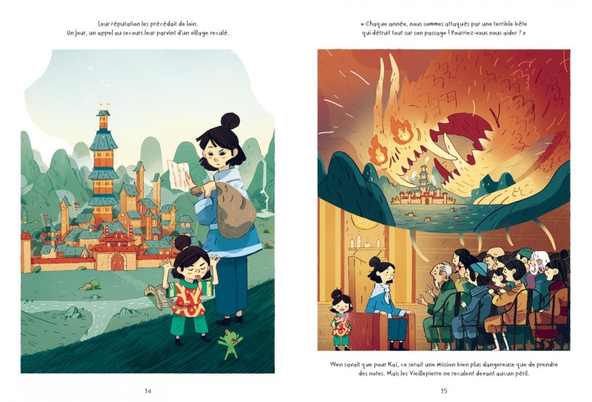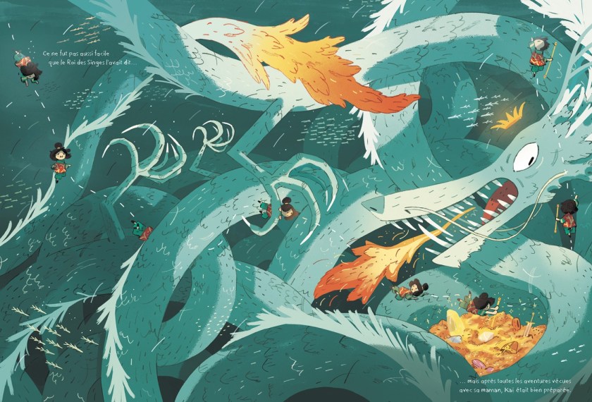 Elle trouvera bien une indication dans les livres de la bibliothèque du village ! Mais Kai, elle voudrait partir à l’aventure, la vraie, pas celle des livres que sa mère passe tant de temps a lire. Quand elle découvre par hasard un parchemin qui pourrait l’aider dans sa quête, elle fausse compagnie à sa mère et part seule, trouver le Roi des Singes : il pourra l’aider à vaincre la terrible bête.