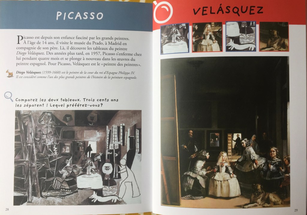A chaque page, le livre vous interroge, un mot a été choisi, en général en relation avec une oeuvre. Certains tableaux ont été choisi pour les détailler. Evidemment Picasso a eu une longue vie et était doté d’un talent exceptionnelle, ce n’est donc pas trop difficile de trouver des dizaines de pistes sur des sujets passionnants qui nécessiteraient pour chacun d’entre eux, un livre complet. Mais c’est une première bonne approche pour votre enfant si il est intéressé par l’Art.
