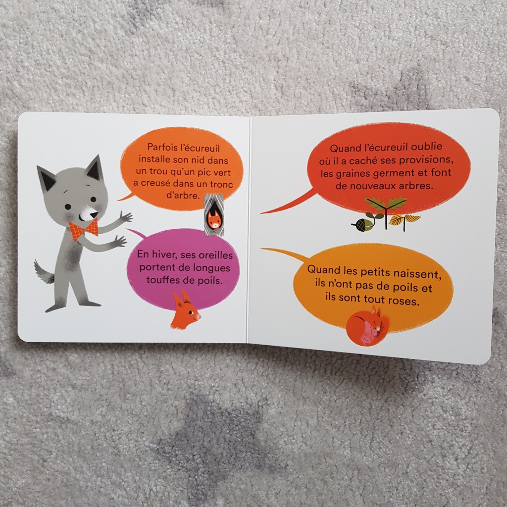 L’enfant fait des hypothèses au fur et à mesure des pages finit donc par découvrir que c’est l’écureuil le coupable. La dernière double page donne 4 informations supplémentaires à son sujet.