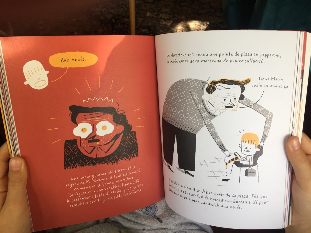 Pour ce qui est de l’histoire, elle se déroule à l’école, la cloche a sonné, c’est l’heure du déjeuner, Marin ouvre sa boîte à lunch et là…plus de sandwich ! Et ce sandwich là, il est très special, Marin le reconnaitrait parmi cent autres, mais ce jour là, à la cafeteria, aucun enfant n’a le sandwich de Marin.