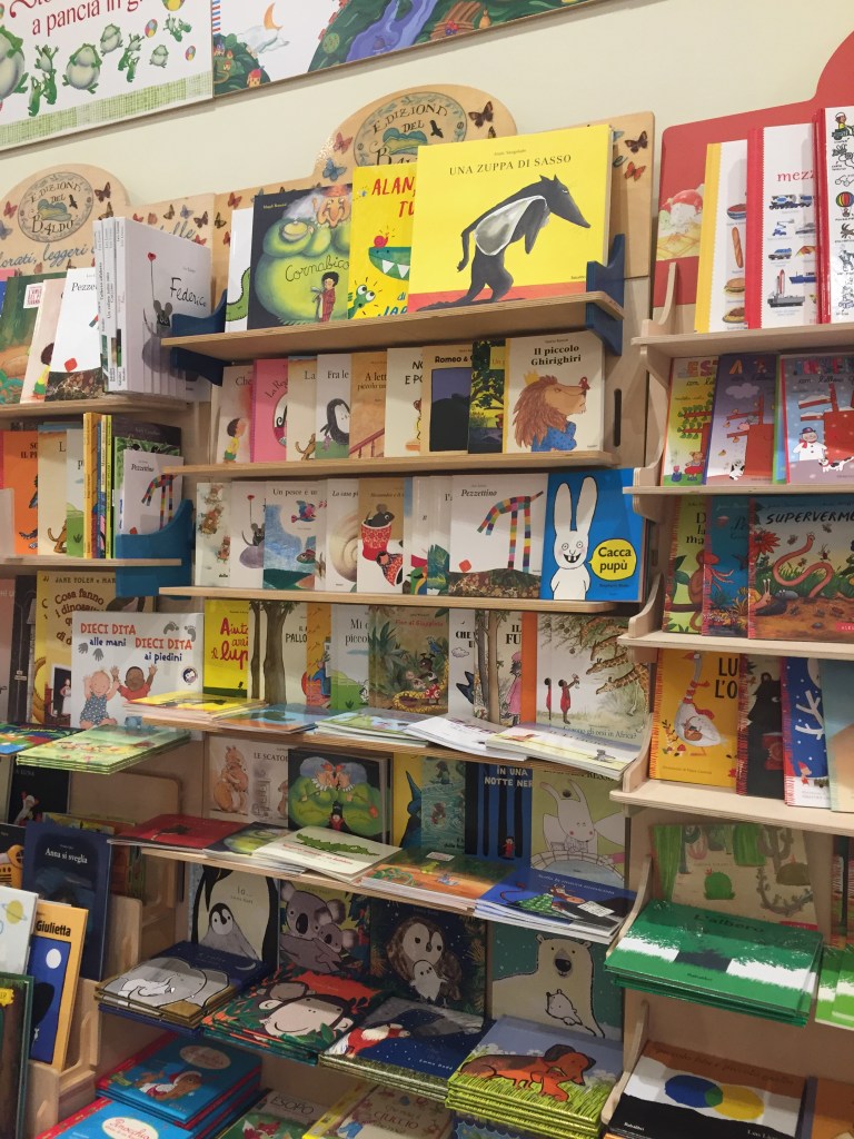 Toujours en voyage en Toscane, je suis allée à Lucques et je n’ai pas pu m’empêcher d’aller faire un tour dans la jolie librairie « Pensieri belli » qui offrait une très grande sélection de livres jeunesse, dont beaucoup traduits du français, ça fait plaisir de vos que nos artistes sont autant représentés.