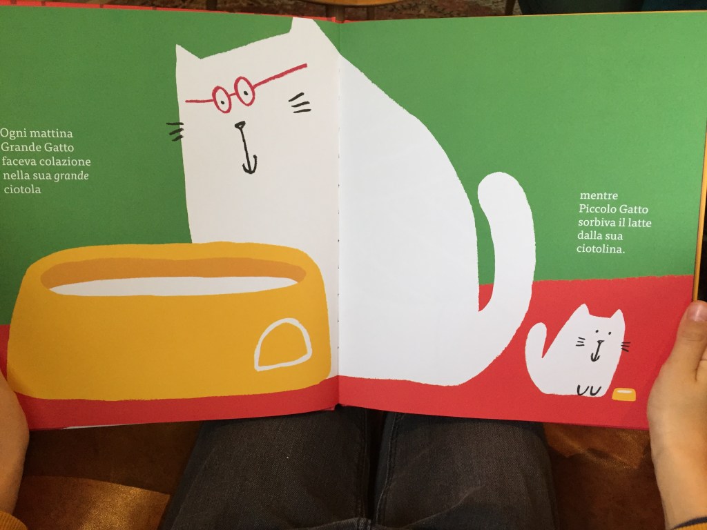 Le premier c’est celui-ci dont les matous blancs m’ont bien plu. On a pas besoin de connaitre l’italien pour comprendre: le grand et le petit. C’est toute la thématique assez simple de ce livre pour apprendre aux enfants à reconnaitre et retenir « le grand » et « le petit »: la répétition, qui fonctionne très bien.