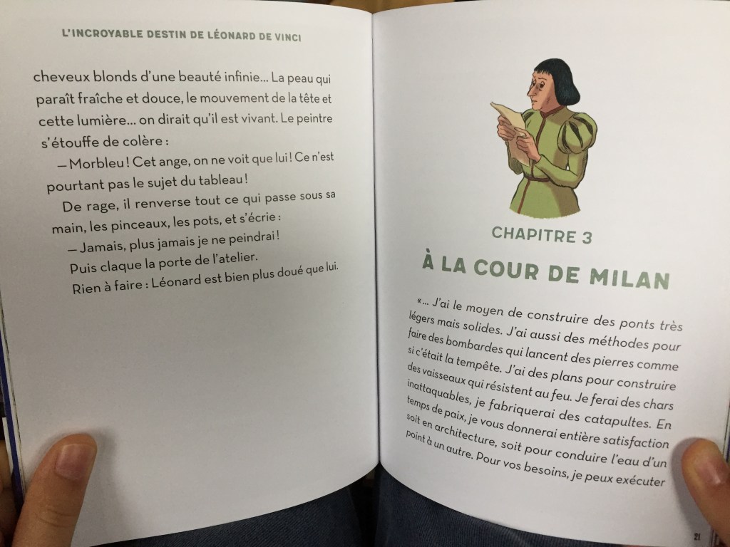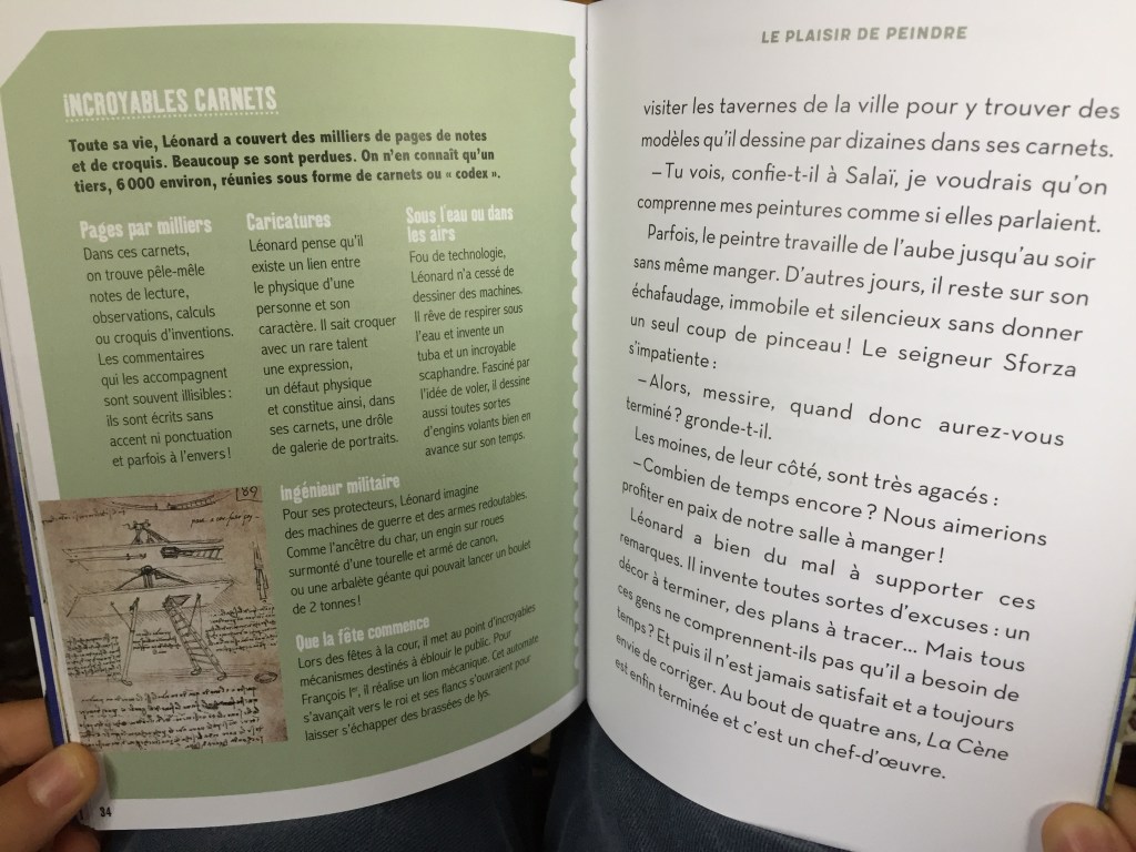 Une partie roman et une partie documentaire. Un récit découpé en 5 chapitres, sous couvert d’une petite histoire, votre enfant apprendra et retiendra énormément d’informations sur Léonard de Vinci, son enfance, son apprentissage, ses déplacements en Europe, ses techniques préférées. On aborde dans le roman, tout ce à quoi il a touché: la peinture (assez peu finalement), la sculpture, les inventions, l’ingénierie. C’est une belle histoire que celle de Léonard.