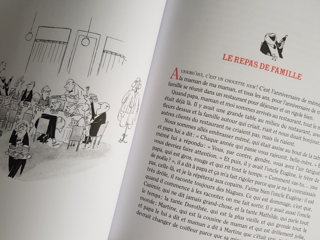 A la maison, les enfants adorent ! Et j’avoue que je prends un malin plaisir à leur relire les histoires de ce bel album pour l’histoire du soir. 60 ans plus tard, on rit toujours autant ! Et quel bonheur de revoir les illustrations de Sempé en grand ! L’ensemble du livre est dans les tons rouge, noir et blanc, pour rester fidèle aux originaux.