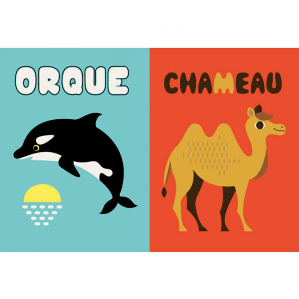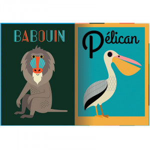 Dans Animaux autour du monde, le petit lecteur peut donc découvrir 32 animaux. A plumes, à poils, à écailles, à quatre pattes, à deux pattes, sans patte… Il y en aura pour tous les goûts. Chaque animal est donc au format affiche. Hauts en couleurs, contrastés, ils sont représentés de manière extrêmement graphique. On fera le tour du monde et de nombreuses espèces en les observant. Les associations de couleurs sont splendides et les typos utilisées sont agréablement variées.
