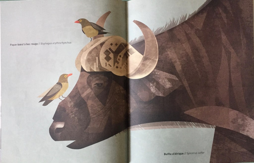Ce livre lui avait été offert à Noël par sa Mamie (le deuxième a suivi de près), il y a quelques années mais régulièrement, on le ré-ouvre, pour continuer de s’émerveiller de ces illustrations si graphiques. Je les trouve personnellement très beaux et prends plaisir à les regarder avec lui, car, je l’avoue, moi aussi j’adore les animaux!