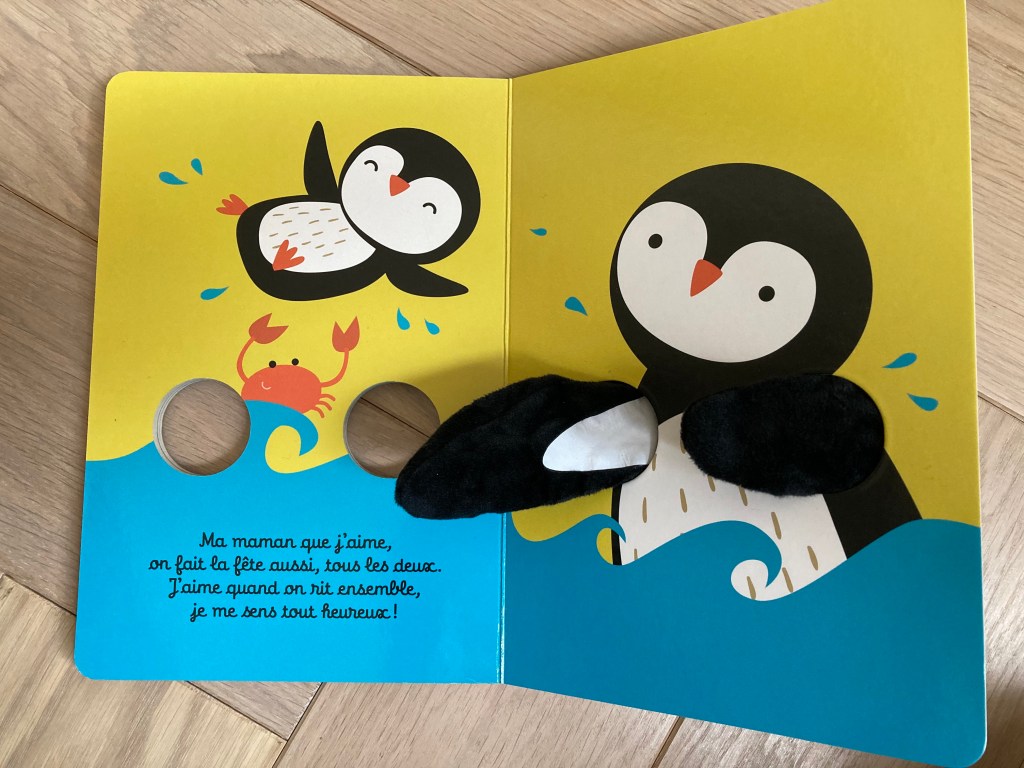 C’est un livre marionnette dans lequel on peut glisser ses doigts pour animer le personnage, ici la Maman pingouin qui invite dès la couverture de faire un câlin.