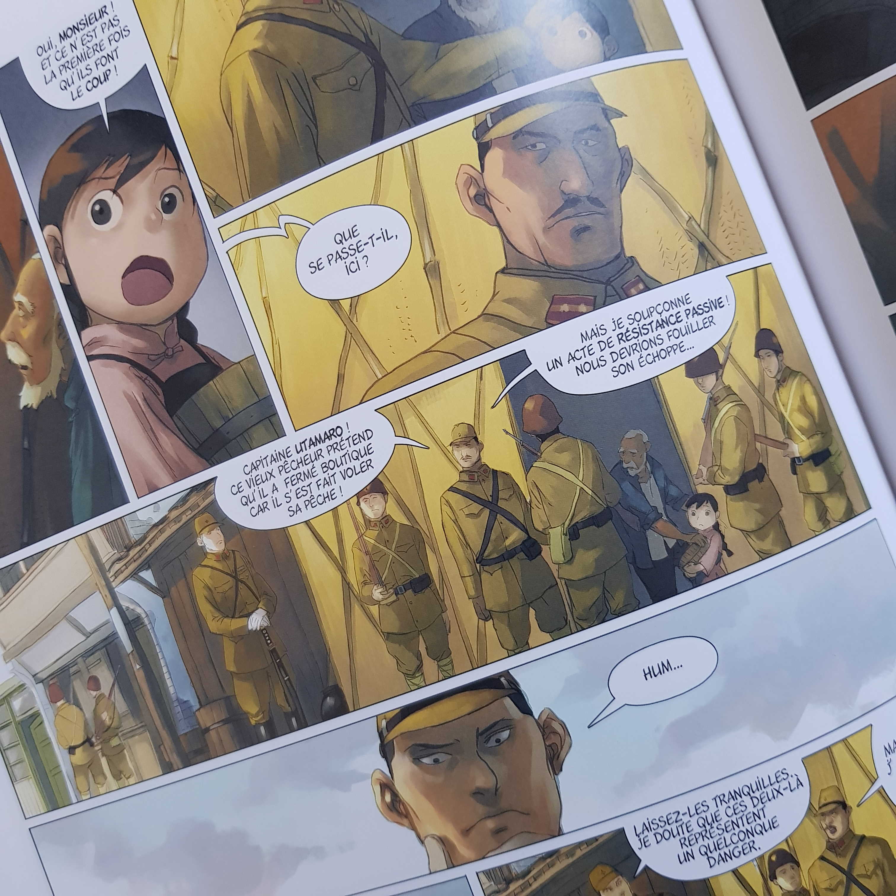 Alors que le dragon s’illumine, la flotte japonaise lui tire dessus, le prenant pour un bateau qui va donner l’alerte de l’attaque aux Chinois. Le dragon est blessé mais Yin convainc son grand-père de le ramener dans leur échoppe pour le soigner. Je vous laisse découvrir la suite. Gentil dragon ? Méchant dragon ? Suspense !