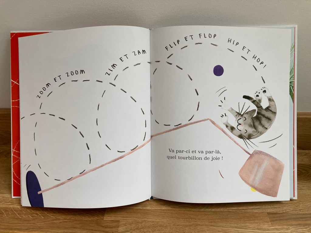 En lui faisant la lecture, votre enfant va suivre la pelote du bout des doigts, ce fil rouge, puis la balle, dans ses rebonds avec ses pointillés bleus; rire avec les innombrables onomatopées.