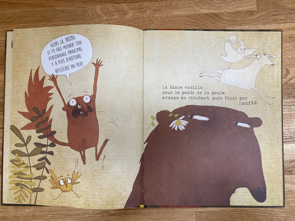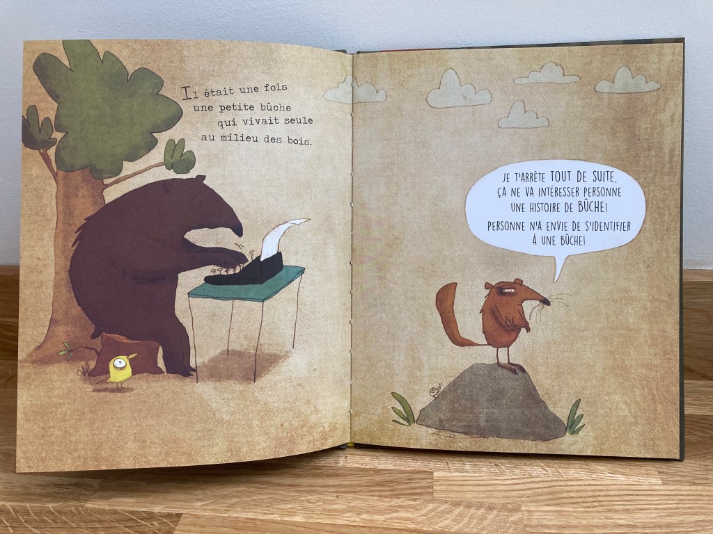 Robear a l’air un peu novice et l’écureuil jamais content, dès la première phrase, il lui explique que l’histoire d’une bûche n’intéressera personne et qu’il vaut mieux partir sur l’histoire d’une « biche » dans les bois.