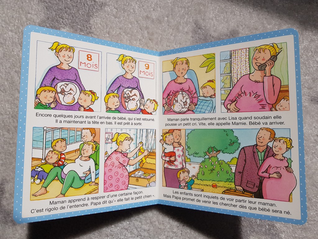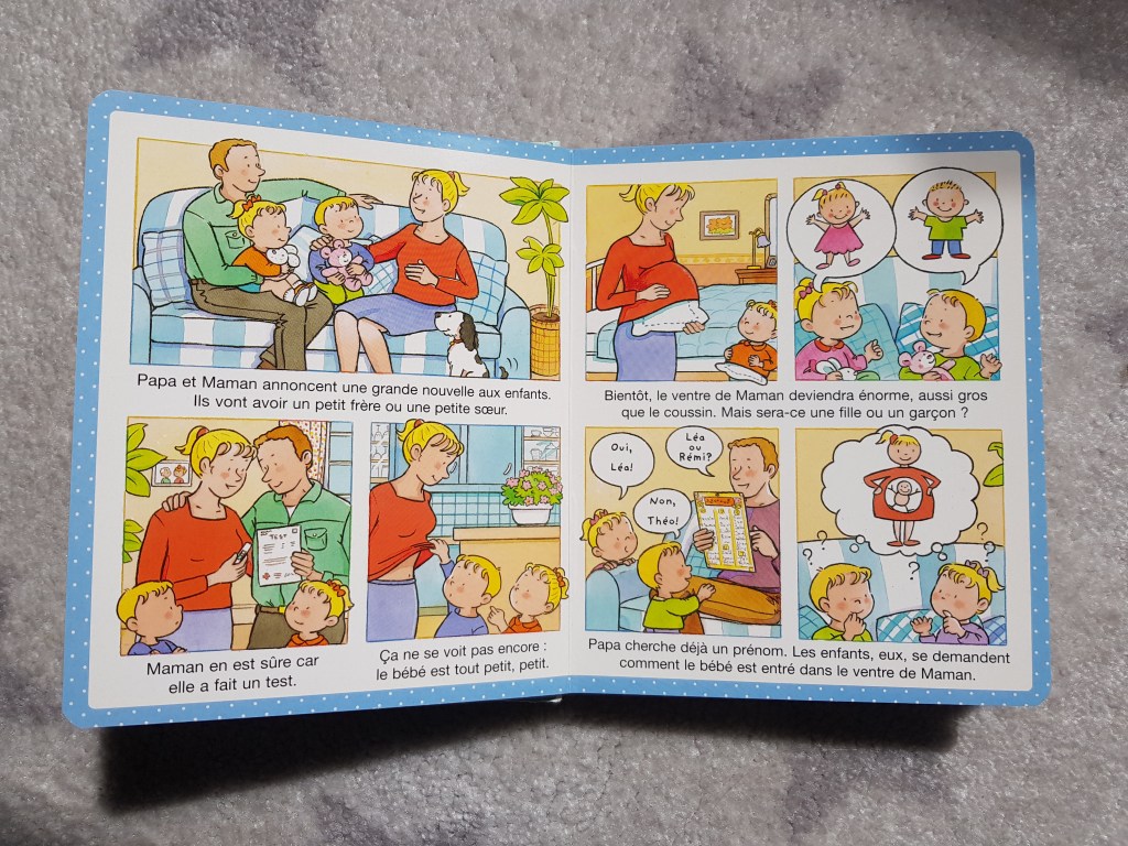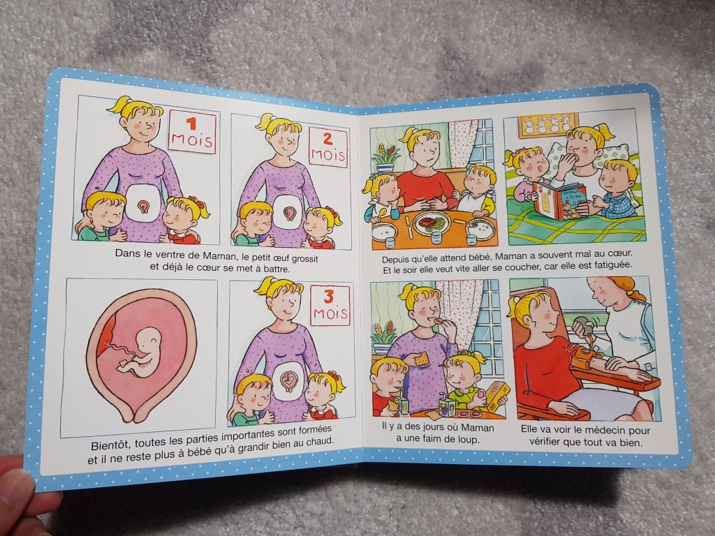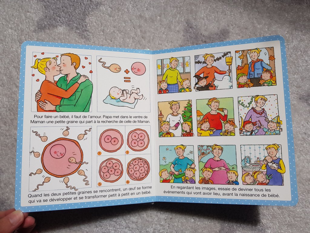 Fleurus est l’édition parfaite pour les documentaires destinés aux tout-petits. Avec ses pages cartonnées, ils peuvent être lus à deux ou tout seul. Cet album est parfait pour répondre à toutes les questions que peuvent se poser des enfants sur la grossesse et la naissance. Le fait que tout soit raconté sous forme d’histoire est un vrai plus et mon fils de 2 ans l’avait beaucoup apprécié et lu de nombreuses fois. Ma fille, elle, continue de le feuilleter de temps en temps, juste parce que le sujet l’intéresse. On pourra découvrir comment on fait les bébés (amour, graines qui se transforment en oeuf), comment le bébé évolue dans le ventre de sa maman et comment la maman change au cours de sa grossesse, les préparatifs (achats, chambre), le départ à la clinique, la naissance, et enfin la rencontre avec le nouveau-né à la maternité et le retour à la maison.