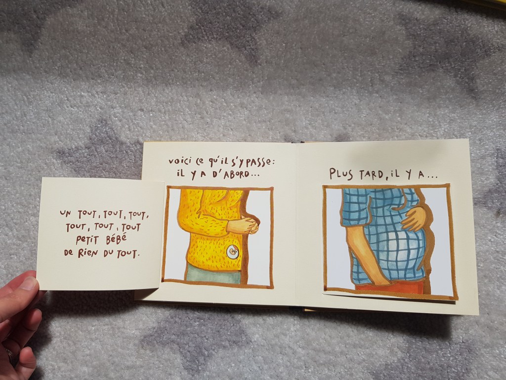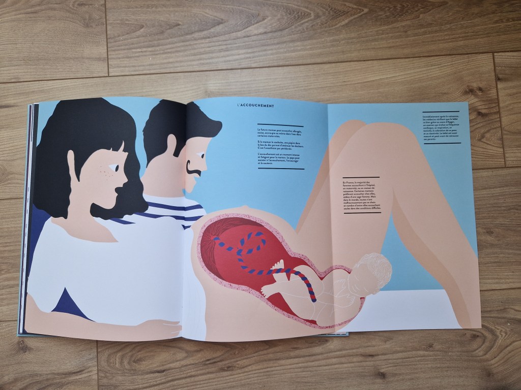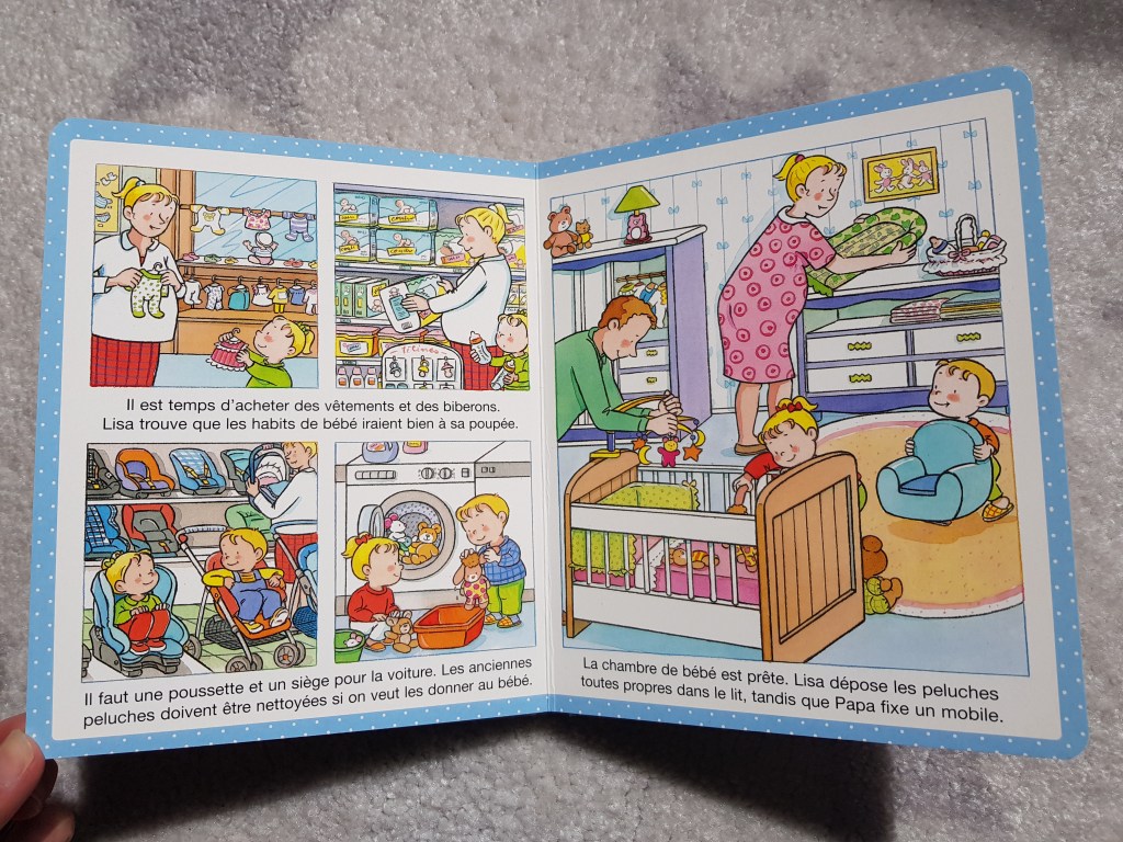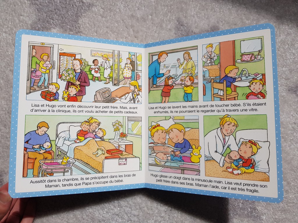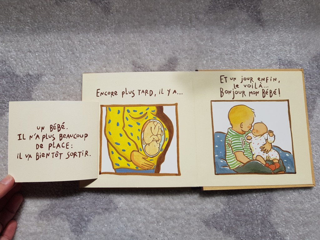 Fleurus est l’édition parfaite pour les documentaires destinés aux tout-petits. Avec ses pages cartonnées, ils peuvent être lus à deux ou tout seul. Cet album est parfait pour répondre à toutes les questions que peuvent se poser des enfants sur la grossesse et la naissance. Le fait que tout soit raconté sous forme d’histoire est un vrai plus et mon fils de 2 ans l’avait beaucoup apprécié et lu de nombreuses fois. Ma fille, elle, continue de le feuilleter de temps en temps, juste parce que le sujet l’intéresse. On pourra découvrir comment on fait les bébés (amour, graines qui se transforment en oeuf), comment le bébé évolue dans le ventre de sa maman et comment la maman change au cours de sa grossesse, les préparatifs (achats, chambre), le départ à la clinique, la naissance, et enfin la rencontre avec le nouveau-né à la maternité et le retour à la maison.
