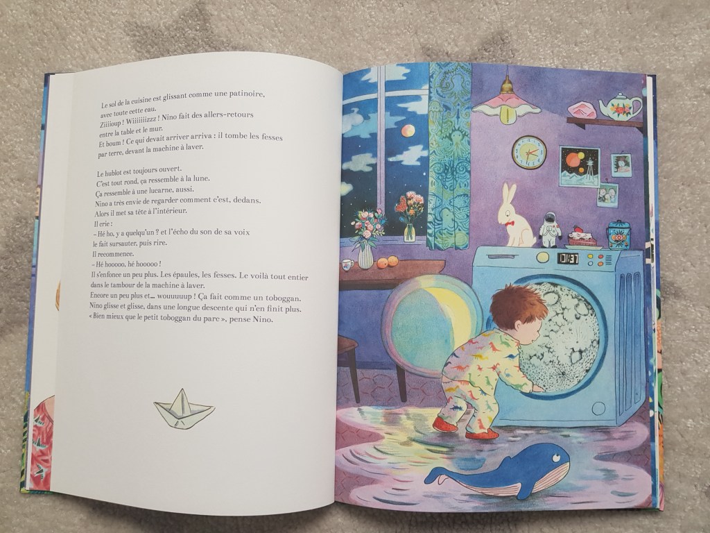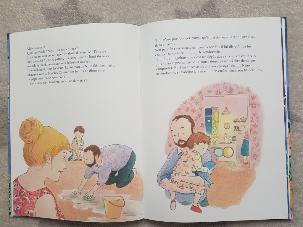 Nino se réveille en pleine nuit. En se promenant dans l’appartement, il trouve ses parents dans la cuisine, troublés, son père épongeant le sol mouillé près du lave-linge. Son papa le recouche. Et c’est là que la véritable aventure commence. Nous embarquons avec Nino pour un voyage fantastique au pays des songes, entre rêve et réalité. A son réveil le lendemain, il trouve non pas ses parents mais sa grand-mère qui est venue le garder : sa maman a donné naissance à son petit frère cette nuit ! Ça pour un dégât des eaux …