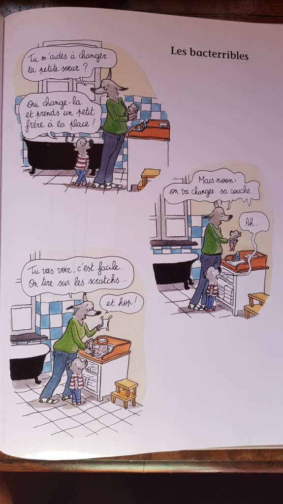 Ce livre s’adresse aux plus grands, plutôt plus de 5 ans. Dans cette BD, Raoul, un petit loup bien sympathique, est devenu un grand frère. Maintenant que sa petite soeur est là, quelle déception ! Car, lui, ce n’est pas une petite sœur qu’il avait commandée ! 13 saynètes de la vie de tous les jours, dans lesquelles Raoul se pose les grandes et les petites questions de la vie. Une succession de moments tendres et amusants, en famille. Comme quand Raoul demande si, quitte a changer sa soeur, on ne pourrait pas la remplacer par un petit frère, ou pourquoi c’est lui qui doit aller se coucher quand sa maman est fatiguée.