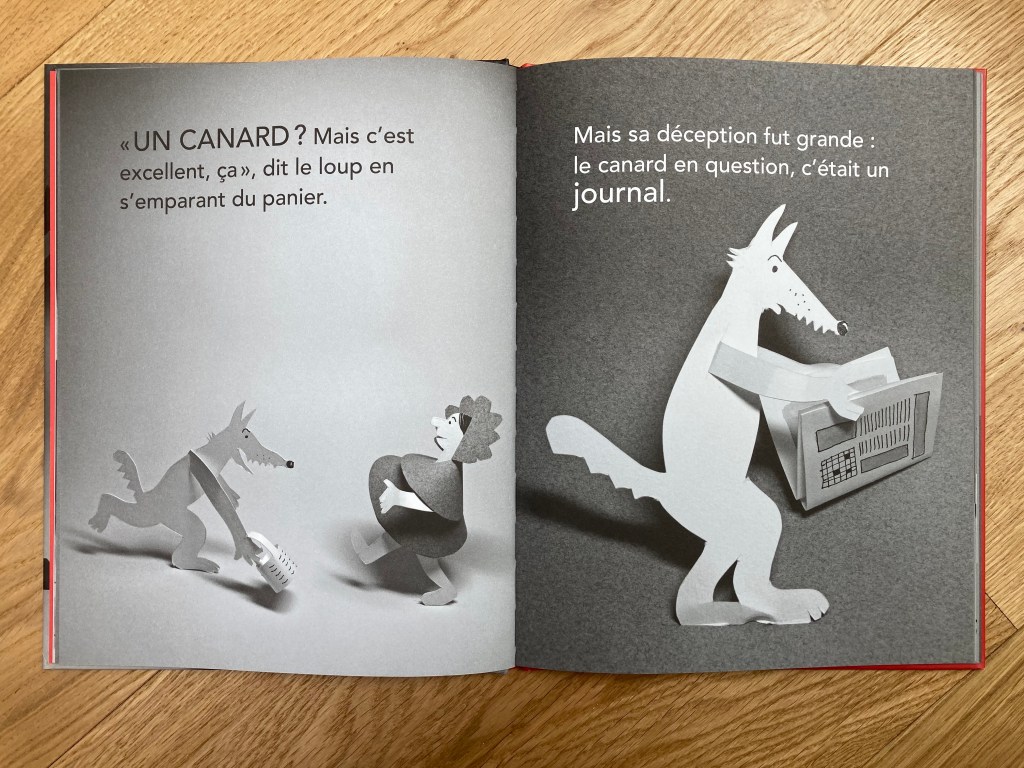 Donc, le loup blanc croise le chaperon gris qui ne transporte pas une galette et un petit pot de beurre, mais un canard. Mmm, il va tout de même pouvoir se régaler, ou pas..