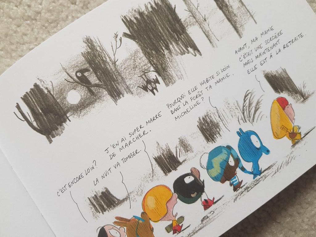 Dans ce tome, Pétole doit imaginer un conte pour l’école. Olive dessine alors un livre d’où sort un petit chaperon jaune avec des bandes réfléchissantes pour qu’on la voie la nuit. Son nom, c’est Micheline. Et Micheline doit amener à sa grand-mère, sorcière à la retraite, une tapette à mouches et un petit pot de gel pour ses cheveux de l’autre côté de la forêt.