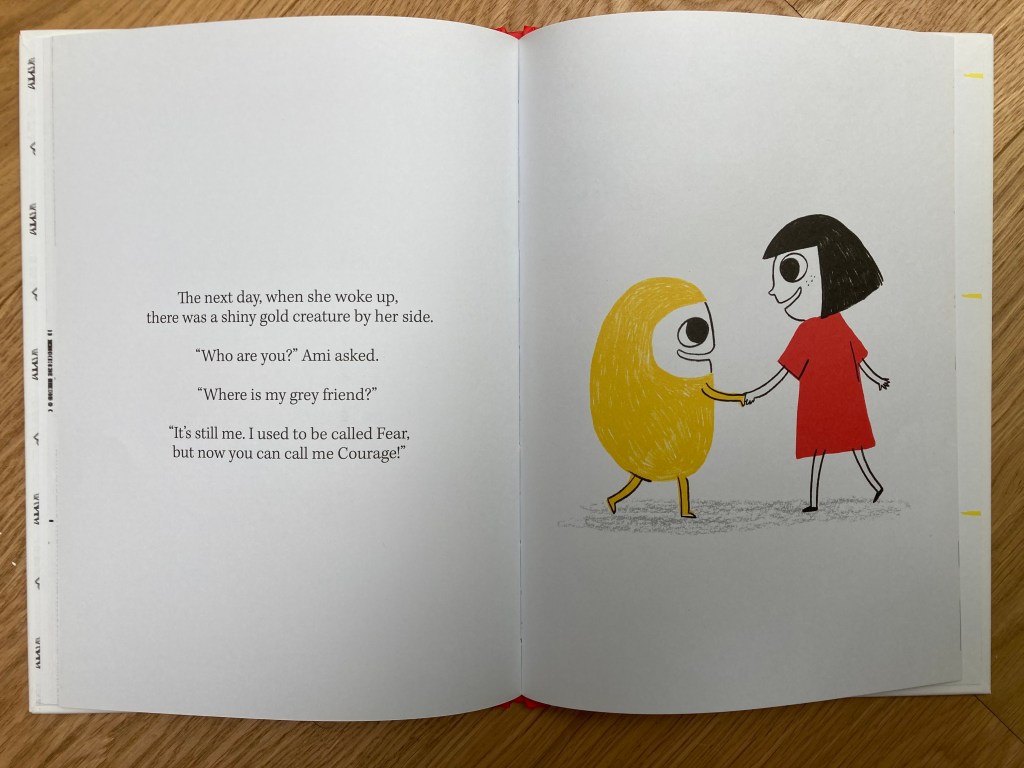 Le lendemain, la crĂ©ature n’est plus grise, elle a une belle couleur dorĂ©e. Ami a l’air surprise et demande oĂč est son ami gris. C’est pourtant bien le mĂȘme, mais il ne s’appelle plus peur, il s’appelle dorĂ©navant « Courage ».