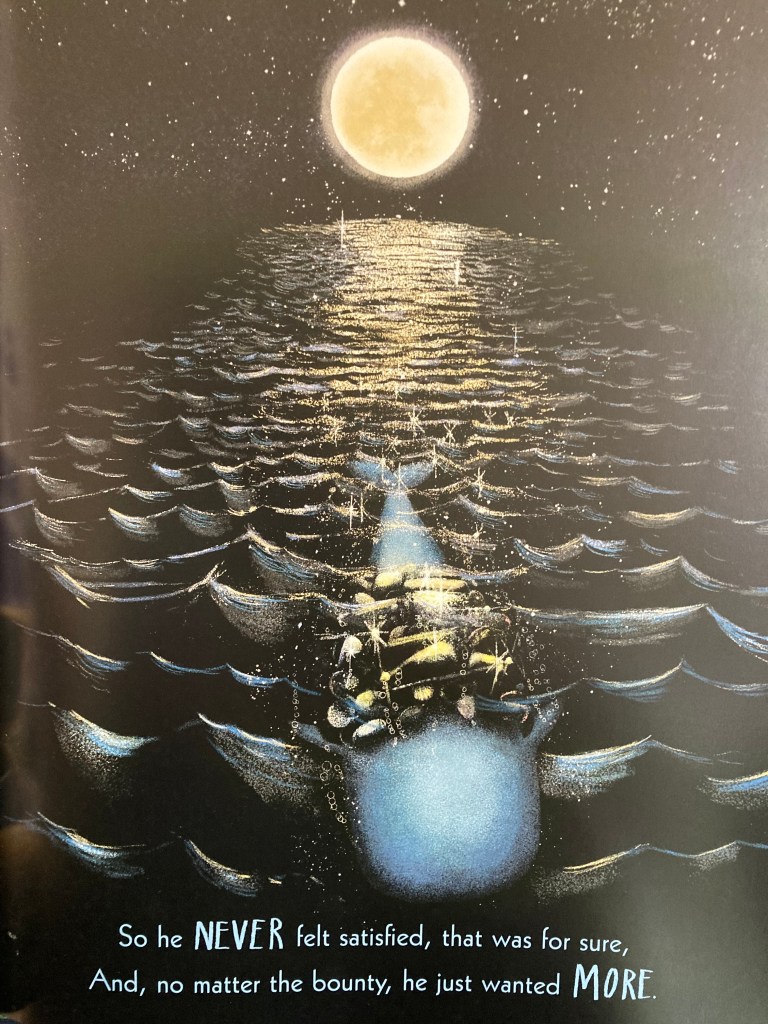 Humfrey, est atteint de ce que l’on nomme en français: la syllogomanie, un trouble qui se caractérise par l’accumulation excessive d’objets inutiles. Donc Humphrey parcourt l’océan à la recherche du trésor qui le fera se sentir entier. Il prend tout sur son passage, tout ce qui brille; mais aucun de ses trésors de ne rend heureux.