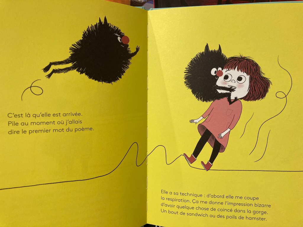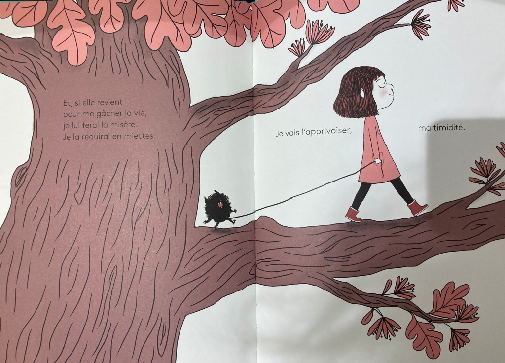 Une petite fille ennuyée en permanence par une petite boule noire poilue qui incarne sa timidité qui s’invite partout, ça aurait pu être moi enfant.