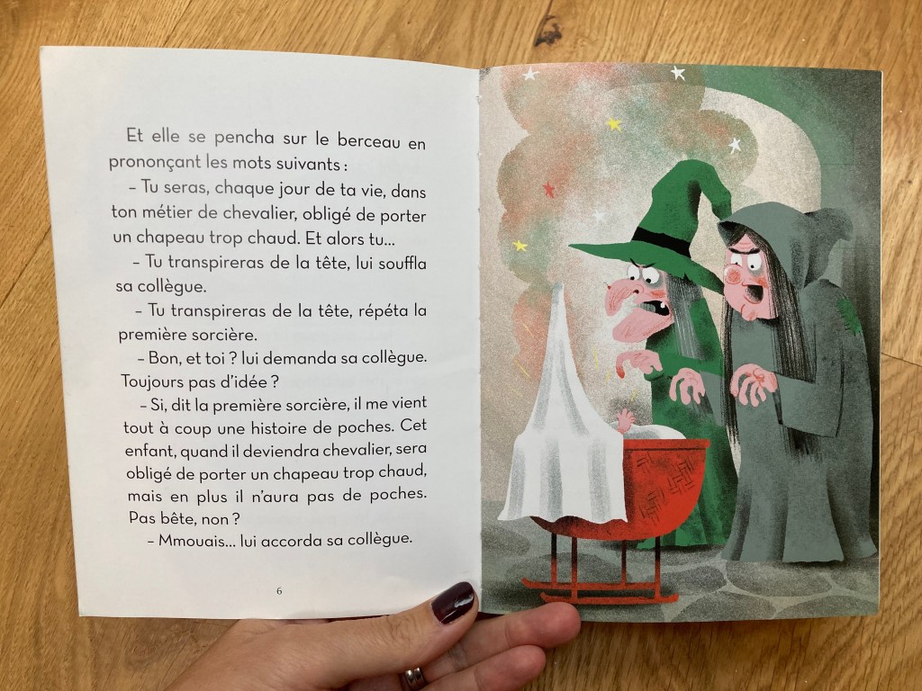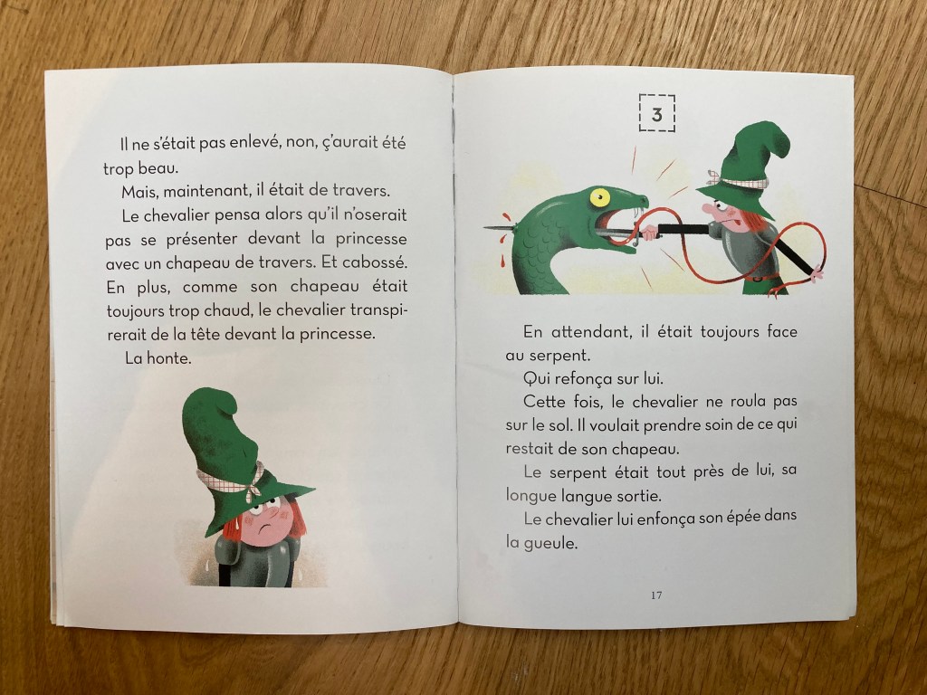 C’est un des premiers livres que j’ai acheté à mon fils lorsqu’il a été en age de commencer à déchiffrer, je n’y connaissais pas grand chose en littérature jeunesse, mais j’avais trouvé le titre amusant et ce petit chevalier transpirant m’avait bien plu.